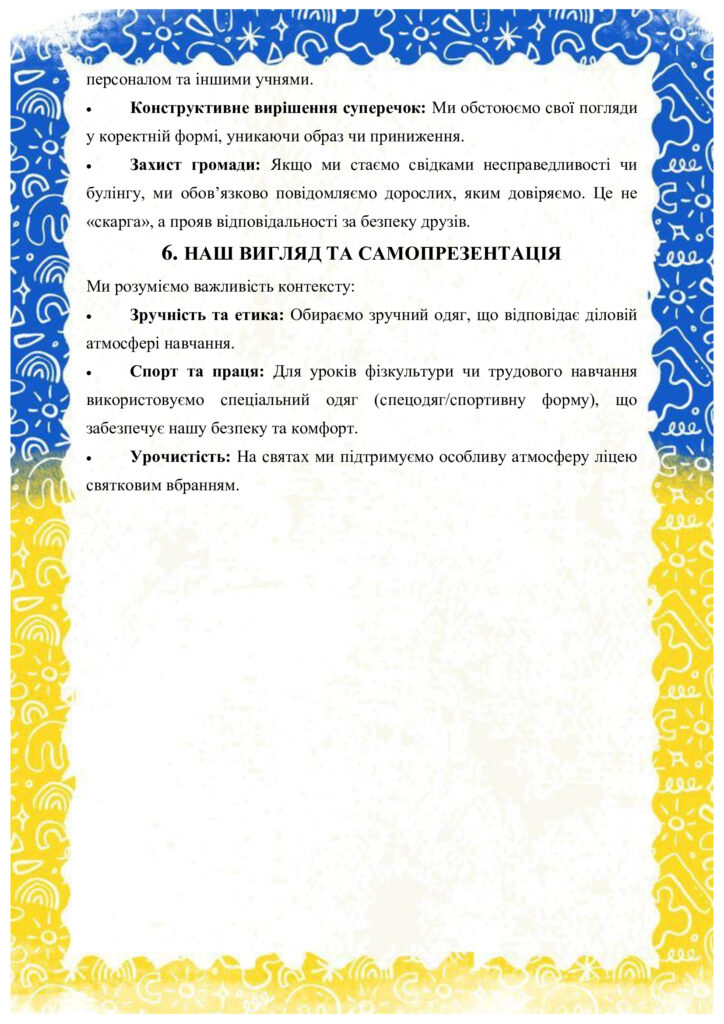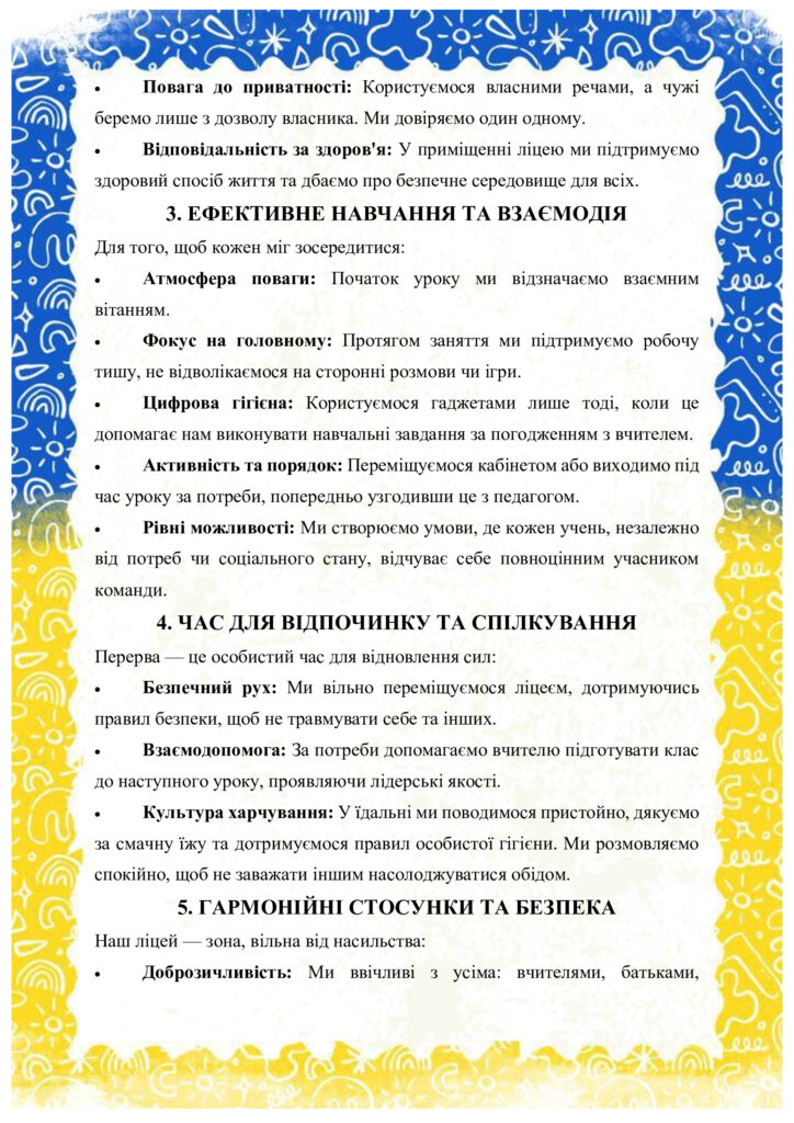 Наша мета — створення безпечного та стимулюючого середовища, де кожен учень може розкрити свій потенціал. Ми будуємо виховний процес на засадах людиноцентризму, партнерства між вчителями, учнями та батьками, а також на принципах академічної доброчесності.